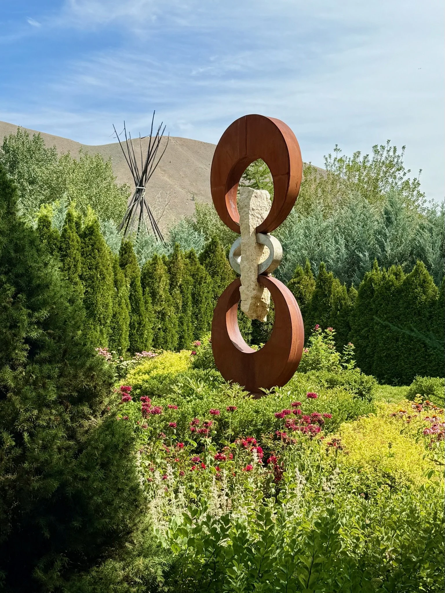• Combines man-made materials (steel, bronze) with natural elements (stone, wood) to explore themes of harmony and contrast.